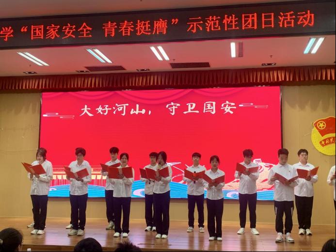 “大好河山,守卫国安”,嘹亮的朗诵声音是青年学子们胸中沟壑的抒发,表达了同学们对新时代国家安全的深刻理解和坚定信念。