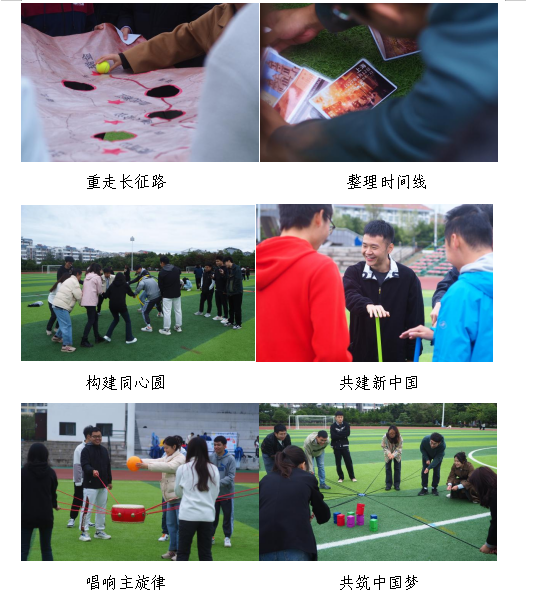 本次素质拓展活动根据新民主主义革命时期、社会主义革命和建设时期、改革开放和社会主义现代化建设新时期、中国特色社会主义新时代四个不同历史时期,将活动分为“重走长征路”“构建同心圆”“共建新中国”“整理时间线”“唱响主旋律”“共筑中国梦”六个环节。“重走长征路”项目,队员们齐心协力控制小球的走向,重温革命先辈们走过的万里长征路。“整理时间线”项目,队员们将抽取的重大历史事件卡牌按照从前往后的顺序排好,了解老一辈中国共产党党员一路走来的光荣历史。“共筑中国梦”项目,队员们同心并力将积木一块一块的摞起来,回顾中国共产党从建党一路走来的艰辛与不易。