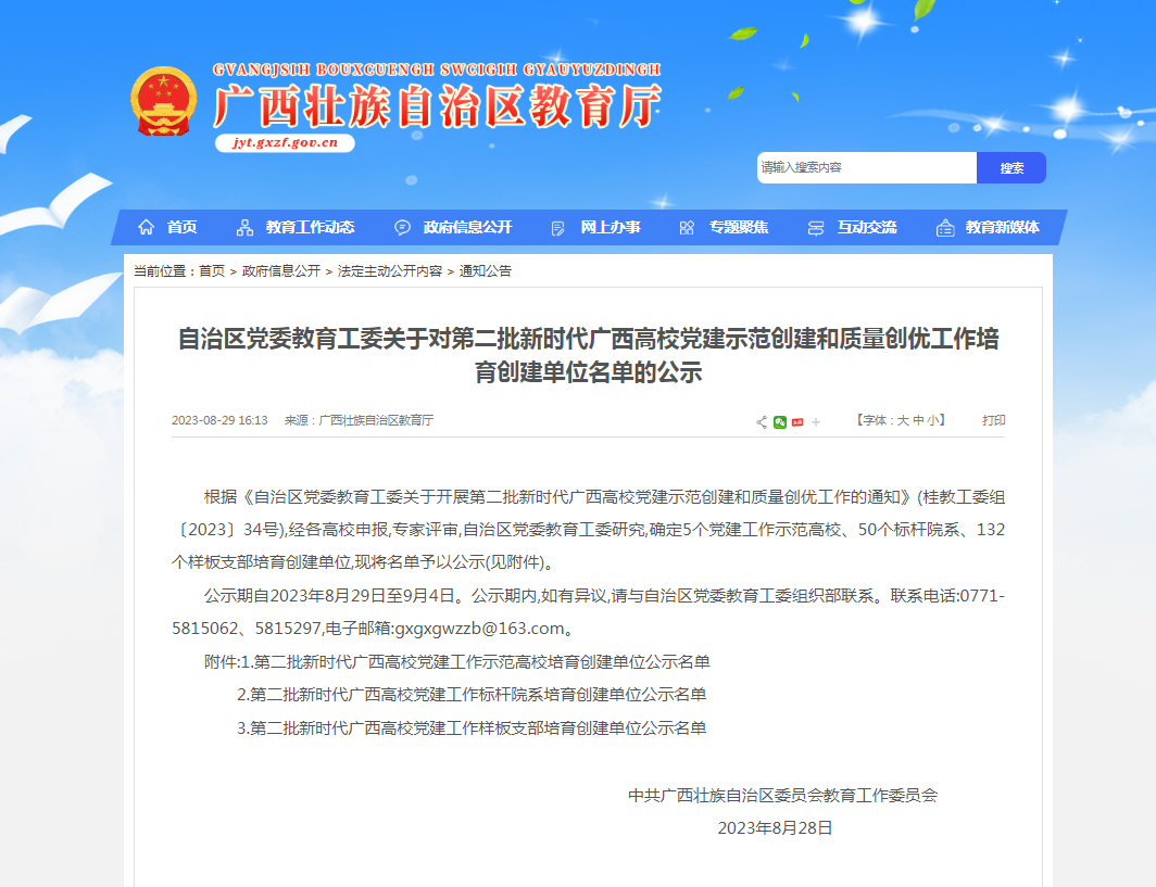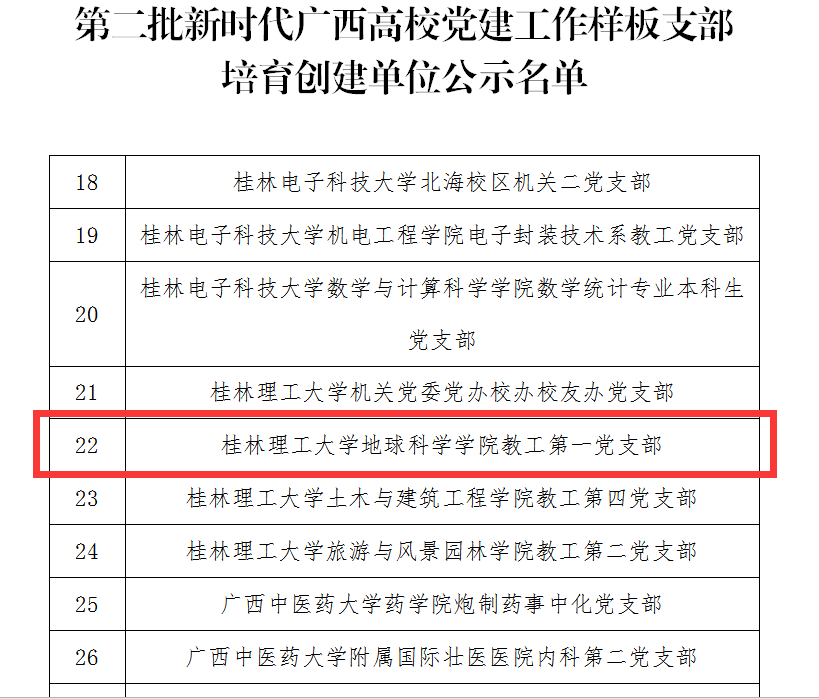 近日,自治区党委教育工委公布了第二批新时代广西高校党建示范创建和质量创优工作培育创建单位的名单,确定了5个党建工作示范高校、50个标杆院系、132个样板支部培育创建单位。我院教工第一党支部成功入选第二批新时代广西高校党建工作样板党支部培育创建单位,实现2019年12月教工第五党支部入选全国党建工作样板党支部以来学院基层党建工作再次取得突破性成果。