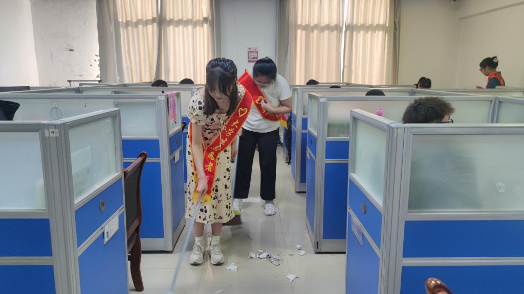 为深入贯彻习近平总书记关于爱国卫生运动的重要指示精神,更有针对性地落实新时代卫生健康工作方针,推进文明新风尚落到实处,形成文明健康人人践行的良好氛围,共享健康好生活,我院还组织党员志愿者积极开展“文明志愿我先行”爱国卫生月志愿服务活动。志愿者们起扫帚、拖把、抹布等工具,对学院大地之子社区红色驿站、研究生自习室、学生活动室等场所进行打扫。一是将桌椅摆放整齐并擦拭桌面,二是将卫生死角和地面清扫干净,三是清理杂物和垃圾。让自习室变得“净起来、亮起来、美起来、文明起来”,营造一个清新怡人、舒适整洁的学习环境和良好的学习氛围。