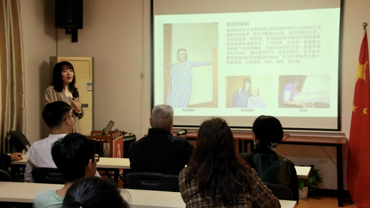 仰睿老师以《重塑非遗——少数民族服饰文化与传统技艺》为题,交流了她走访各地的少数民族的所见所闻,总结了各地区各民族服饰的主要特点和制作工艺并详细介绍了广西非遗壮锦的制作工艺和壮锦纹样的特点。