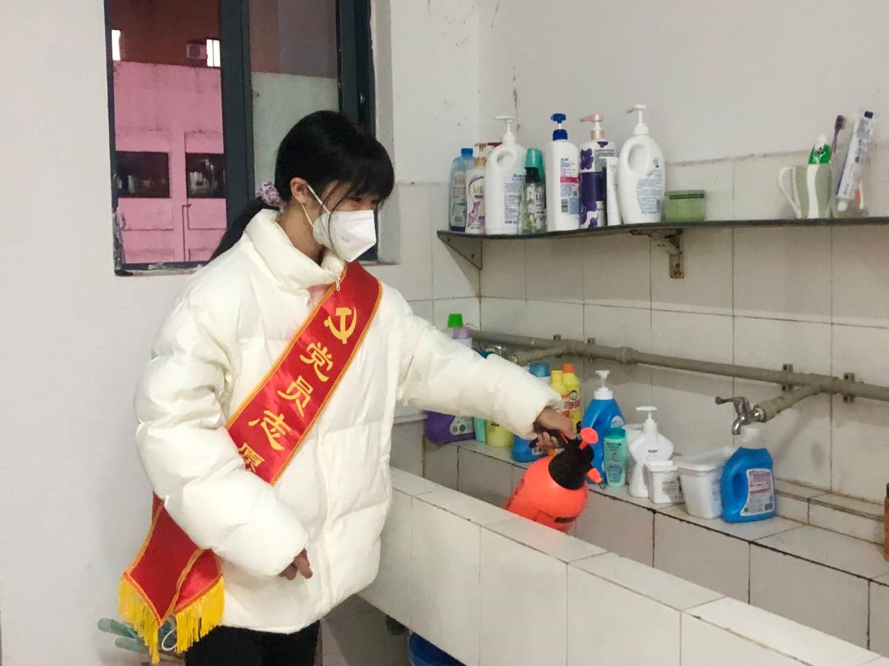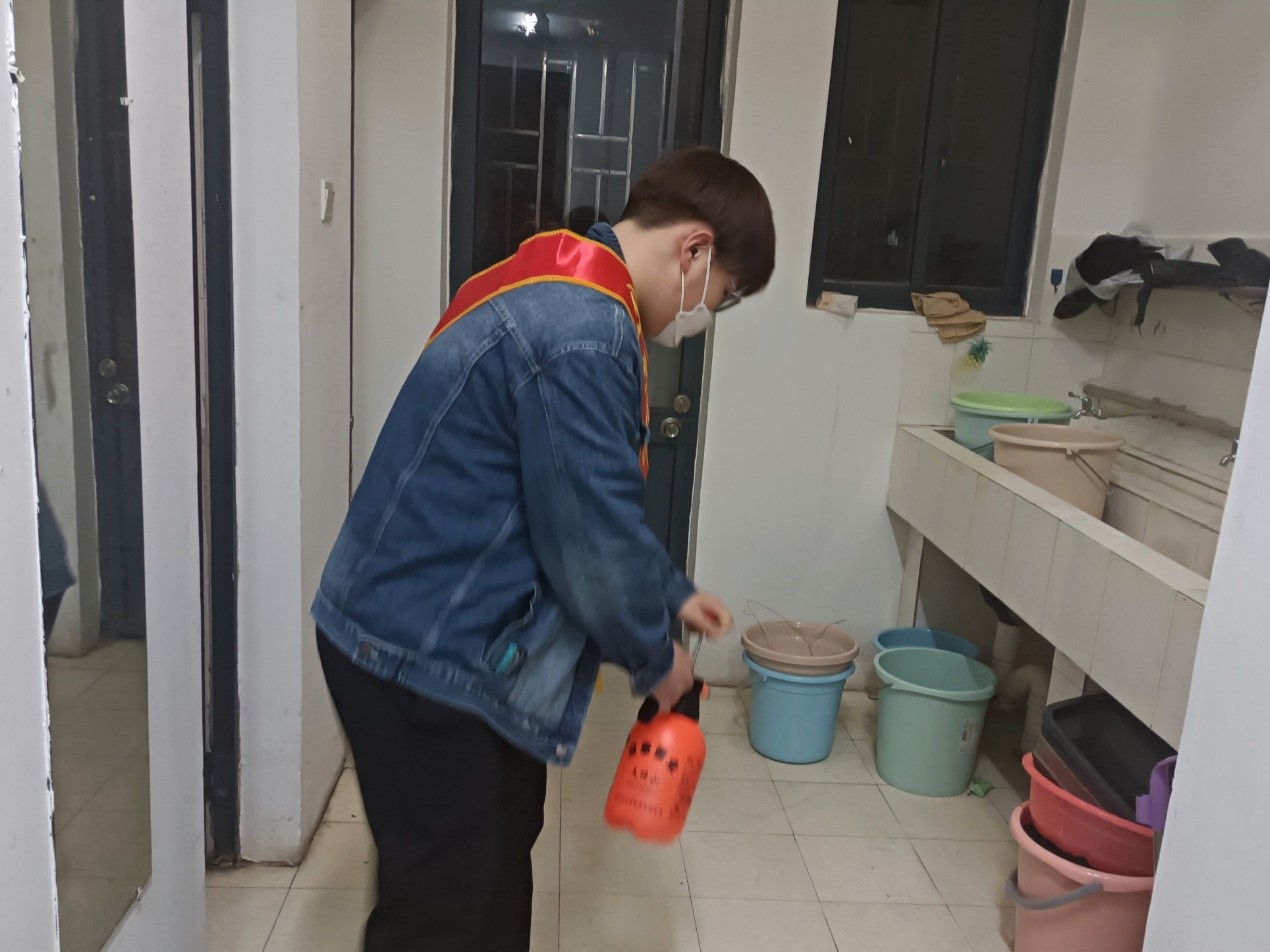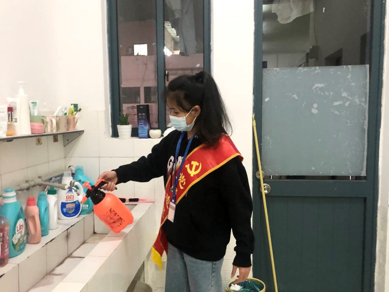 在进行合理分工分组及工具配备后,党员志愿者们全程佩戴口罩,严格按照卫生消杀要求进行规范操作,采用“地毯式”的消毒方法,从心开始、从细着手地对学生宿舍开展消杀工作,做到“全覆盖、无死角、零遗漏”。同时,重点加强对洗手间、水池、角落、垃圾桶等关键区域的消杀力度,确保消杀的质量不打折扣。在消杀过程中,学生干部细心地提醒同学们多开窗通风,保持室内空气清新;督促同学们按时就寝保证良好的作息习惯,自觉践行“健康第一”理念,当好自身健康第一责任人。