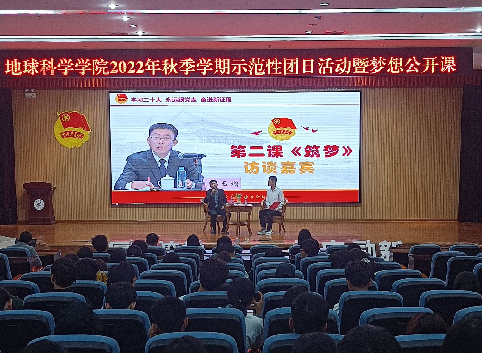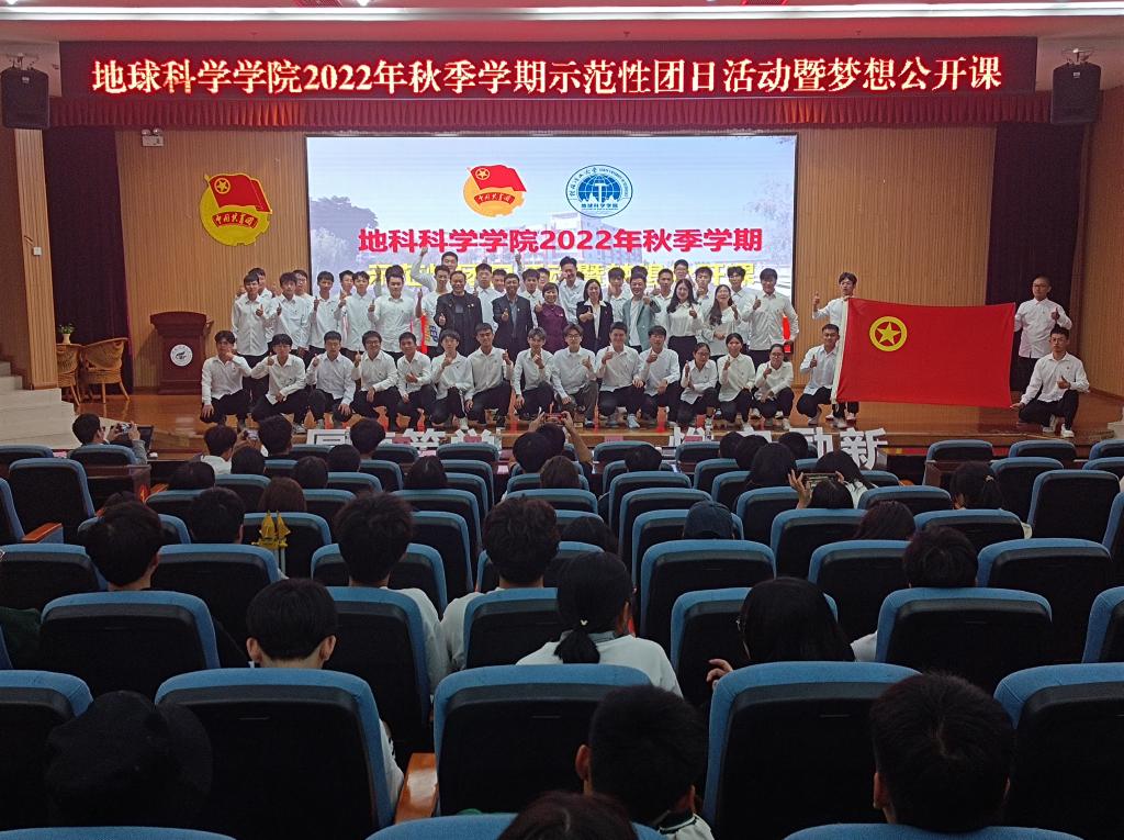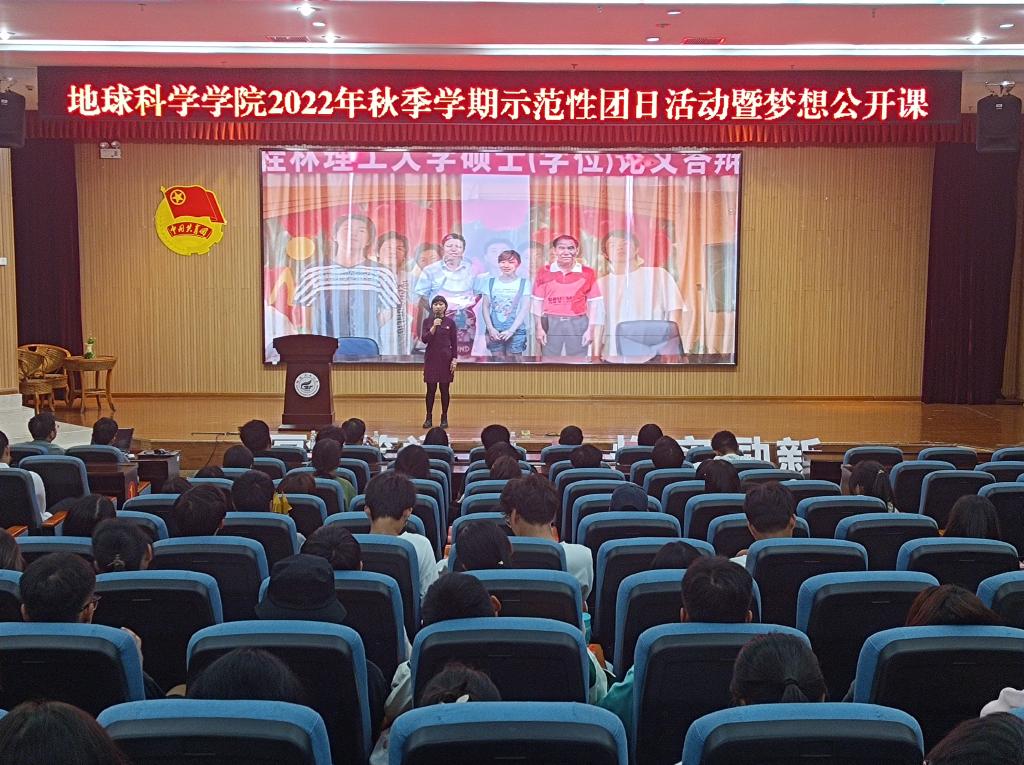 会议伊始,主持人介绍出席本次示范性团日活动的各位嘉宾,带领大家共同奏唱团歌。本次示范性团日活动共分为三个篇章,第一篇章:罗盘领航·青春向党。广西三一〇核地质大队副大队长、总工程师罗桥花用朴素的语言,道出了作为一名女地质队员的光荣与自豪,教育引导广大青年学子矢志报国,以献身地质事业为荣、以找矿立功为荣、以艰苦奋斗为荣,把个人的理想追求融入党和国家事业之中,吃苦奉献、砥砺图强随后表演的地质人之歌,更是歌颂了地质工作者励精图治、不畏艰险的奉献精神和爱国情怀。第二篇章:放大知微·青春奋斗。首先学生代表徐锐同学社会实践专题分享,介绍在社会实践过程中弘扬践行黄大年精神学思践悟黄大年先进事迹,鼓励在场学子领悟“脚踏实地,坚守岗位,唯痴迷者成大业’的精神”随后学院副院长吕玉增教授与大家分享了他参与“3·21”东航MU5735航空器飞行事故排查救援勘探工作的难忘经历,勉励在场学子学好知识、练好本领,在祖国和人民需要时,要敢于挺身而出迎难而上。第三篇章:铁锤筑梦·青春强国。由学院组织员吕思慧老师《征程》主题团课分享带领大家共同回顾学院缪秉魁教授在南极的几次科考经历,讲述了缪秉魁教授在南极科考期,不畏艰难险阻,积极投身到各项科研当中,将“爱国、求实、创新、拼搏”的南极精神和“艰苦创业、敬业奉献、团结协作、开拓创新”的桂工精神完美结合,用行动诠释着他的爱国情怀。活动最后一个环节由我院团委书记吴田波老师为新入团团员颁发团徽,带领同学们现场重温入党誓词。至此,我院“学习二十大,永远跟党走,奋进新征程”示范性团日活动暨梦想公开课圆满结束。
