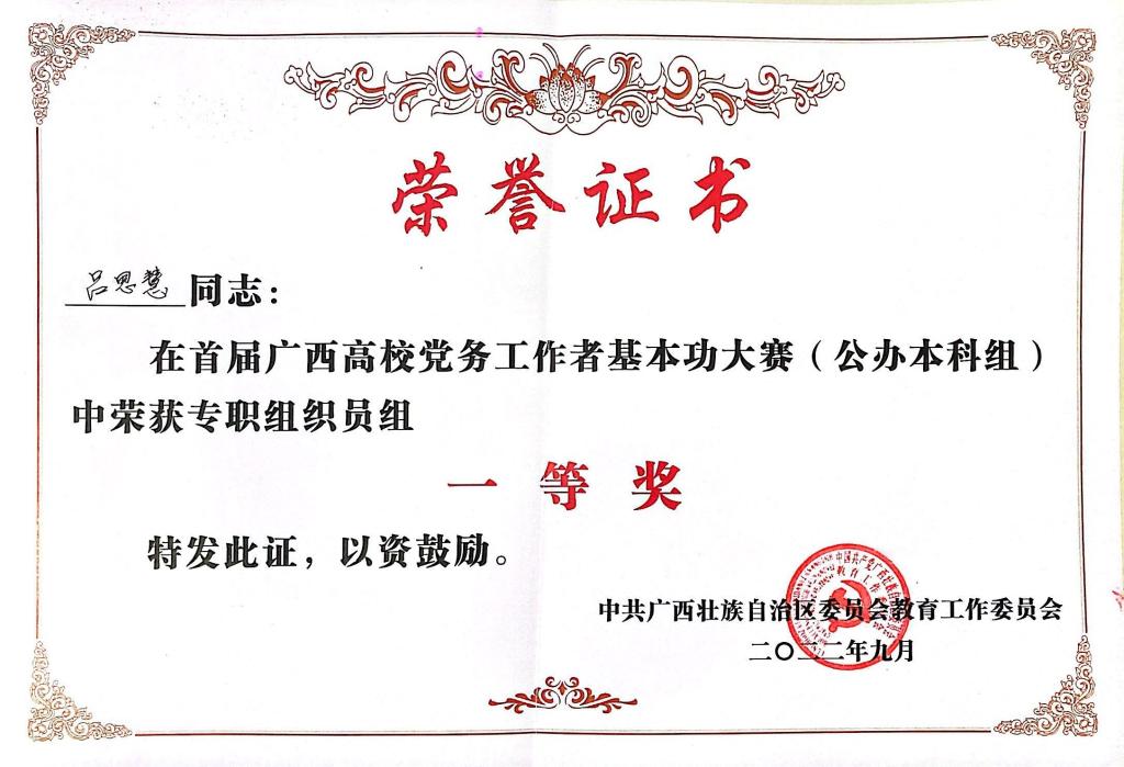 9月22日至23日,由自治区党委教育工委主办,我校承办的首届广西高校党务工作者基本功大赛公办本科院校组在学校屏风校区举行,来自全区25所公办本科院校的72名党务工作者参加了比赛。经过精彩和激烈的同台竞技,共决出一等奖9名、二等奖21名、三等奖42名,其中学院吕思慧老师代表学校参赛获专职组织员组一等奖。