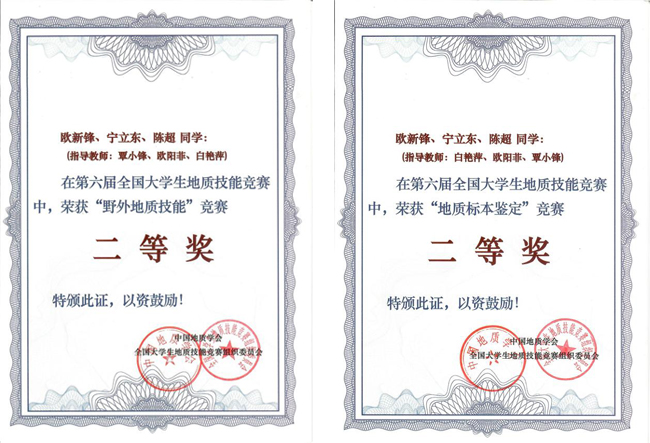 “野外地质技能二等奖”和“地质标本鉴定二等奖”证书