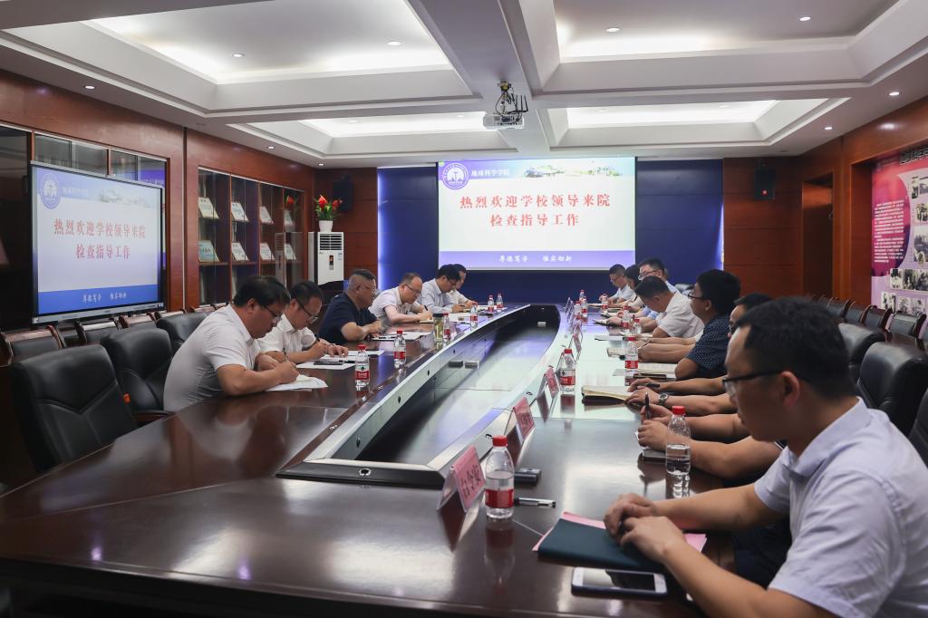 邓军听取了学院发展历程、机构设置、师资队伍建设、党建工作、本科生教育、学科建设、科学研究、教育部工程中心建设、博物馆建设等基本情况以及工作建议的汇报,对学院近年来学科发展、学生教育、社会服务、国际教育合作、文化传承创新等工作取得的成绩表示充分肯定,对60多年来一代又一代地质人的接续奋斗给予肯定。