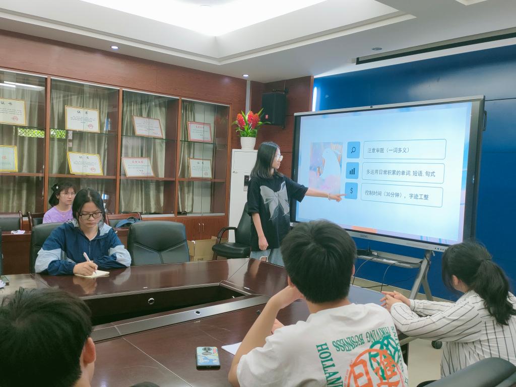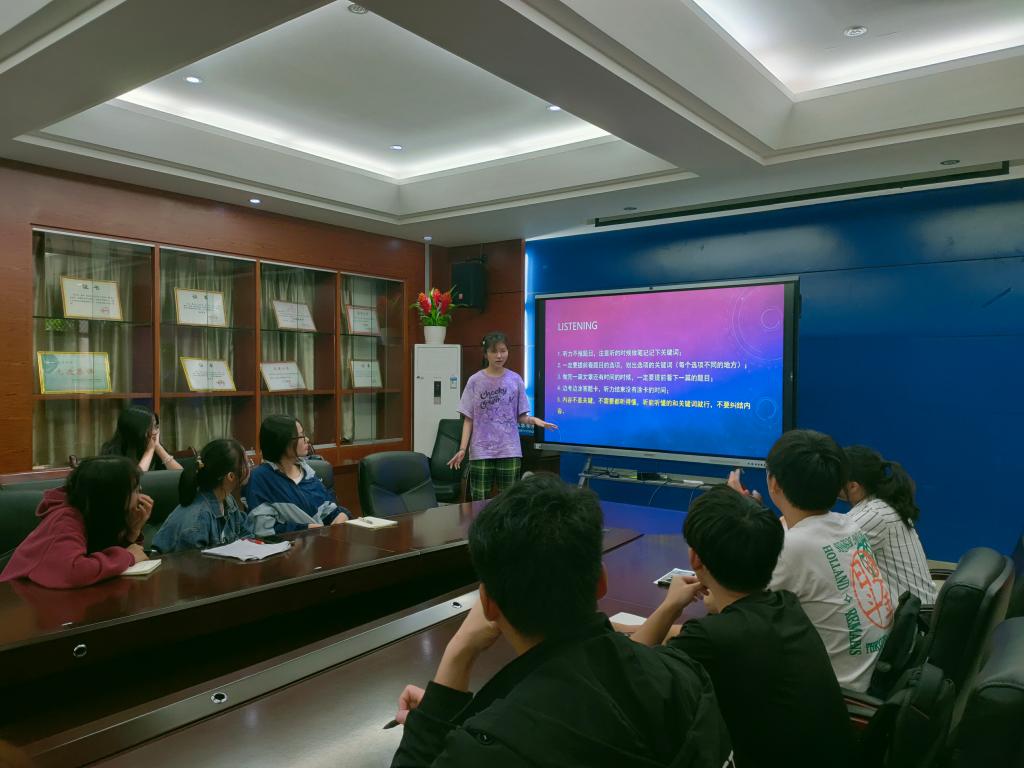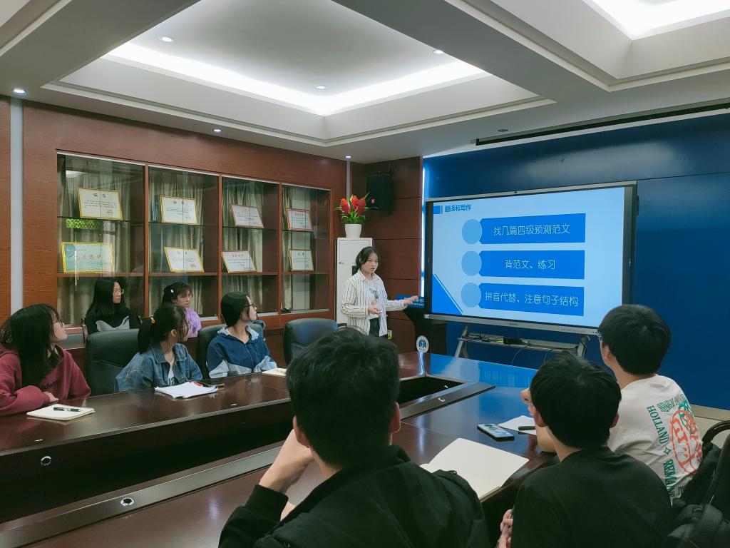 刘欣莹同学从听力、作文、阅读、翻译四个部分进行分享。她表示,“听力”不要随意更改答案,“作文”一定准备范文以备不时之需,“阅读”要抓住题干关键词,“翻译”时可灵活使用相似词进行替换;沈佳丹同学强调要注意分值构成和做题顺序,要根据阅读理解中高频词和生僻词进行单词的记忆,要跟随真题听力进行练习;郭咏欣同学强调刷题的重要性,一是要刷真题,二是所有题型都要刷,包括听力和作文,三是严格按照考试规定时间来刷题,方能真正发挥刷题的作用。