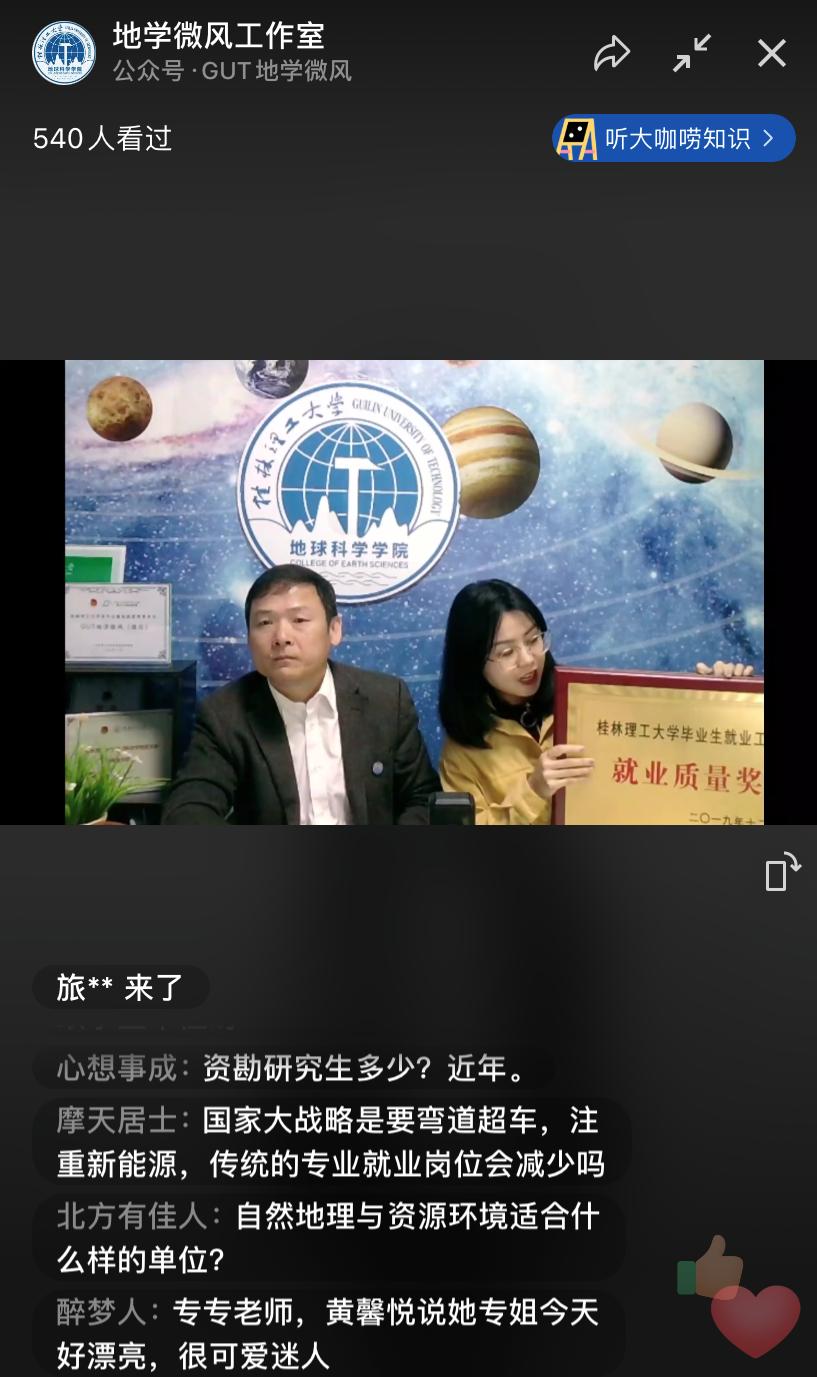 本次活动通过学院微信公众号“GUT地学微风”进行直播,共分为四个环节。首先,师生家长共同观看了beat365手机版官网入口宣传片,初步了解了学院的发展概况。其次,熊彬院长向大家介绍了学院的专业特色及建设情况,并对学院各个专业人才培养方案、考研和就业情况进行详细讲解,熊彬院长对家长在弹幕中提出的问题进行了一一解答。随后,夏雪莲老师对高校学生资助政策及成效进行宣讲,介绍了“奖贷助勤补免+绿色通道”等多元混合资助政策体系,从学生资助工作制度、资助资金投入、资助育人队伍和平台、“凌雁工程”育人特色品牌等方面讲解了学校资助工作概况和资助育人成效。最后,林丽专老师播放了校园生活环境和学生在校活动视频,家长们纷纷表示,学校生活条件和环境非常好,学生活动丰富多彩。