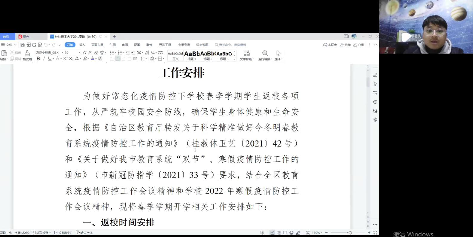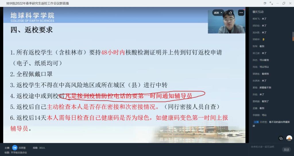 为扎实有序地推进学生安全返校,确保常态化疫情防控下学生春季返校各项工作顺利开展,根据《自治区疫情防控指挥部办公室关于做好2022年春季学期开学返校工作的紧急通知》(桂新冠防指办〔2022〕36号)精神和《关于做好桂林市各级各类学校2022年春季学期开学疫情防控工作的通知》(市新冠防指学〔2022〕4号)、《关于做好桂林市当前疫情防控工作的紧急通告》(市新冠防指学〔2022〕5号)要求,并结合学校总体部署及相关会议精神以及学院学生工作实际。桂林理工大学beat365手机版官网入口第一时间迅速反应多次部署,召开学生工作专项部署会,建立、落实“第一责任人”制度。会后,各年级辅导员根据会议精神,于2月23-24日期间先后利用腾讯会议、钉钉、QQ视频等方式召开线上年级会议及主题班会,认真传达和布置了学校学院的返校相关文件通知精神与工作要求,有力落实开学疫情防控教育工作,为新学期学生工作开好局奠定坚实的基础。