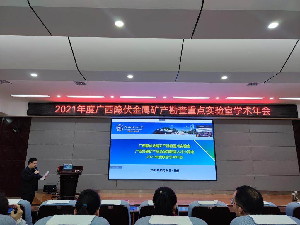 12月24日,广西隐伏金属矿产勘查重点实验室在雁山校区1号楼501学术报告厅举办了2021年学术年会暨学术委员会会议,学术年会由广西关键矿产资源深部勘查人才小高地协办,以“线上+线下”结合的方式举行。来自中国科学院、中国地质科学院、南京大学、北京大学、中国地质大学(北京)、中山大学、广西地质矿产勘查开发局、广西地质调查院和广西区域地质调查研究院等高校和单位的10余位区内外学术委员会专家委员线上出席会议,重点实验室相关人员和研究生90余人现场参加会议。