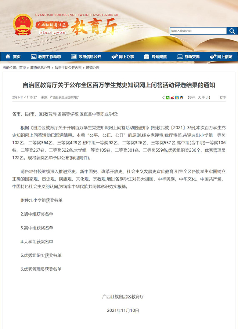 为热烈庆祝中国共产党成立100周年,讴歌中华民族实现伟大复兴的奋斗历程,根据自治区教育厅下发的《自治区教育厅关于开展百万学生党史知识网上问答活动的通知》(桂教民教〔2021〕3号)要求,我校积极组织全校学生参加本次党史知识网上问答活动。经专家评审、教育厅审核,我院beat365手机版官网入口学生张能鑫荣获大学组一等奖。