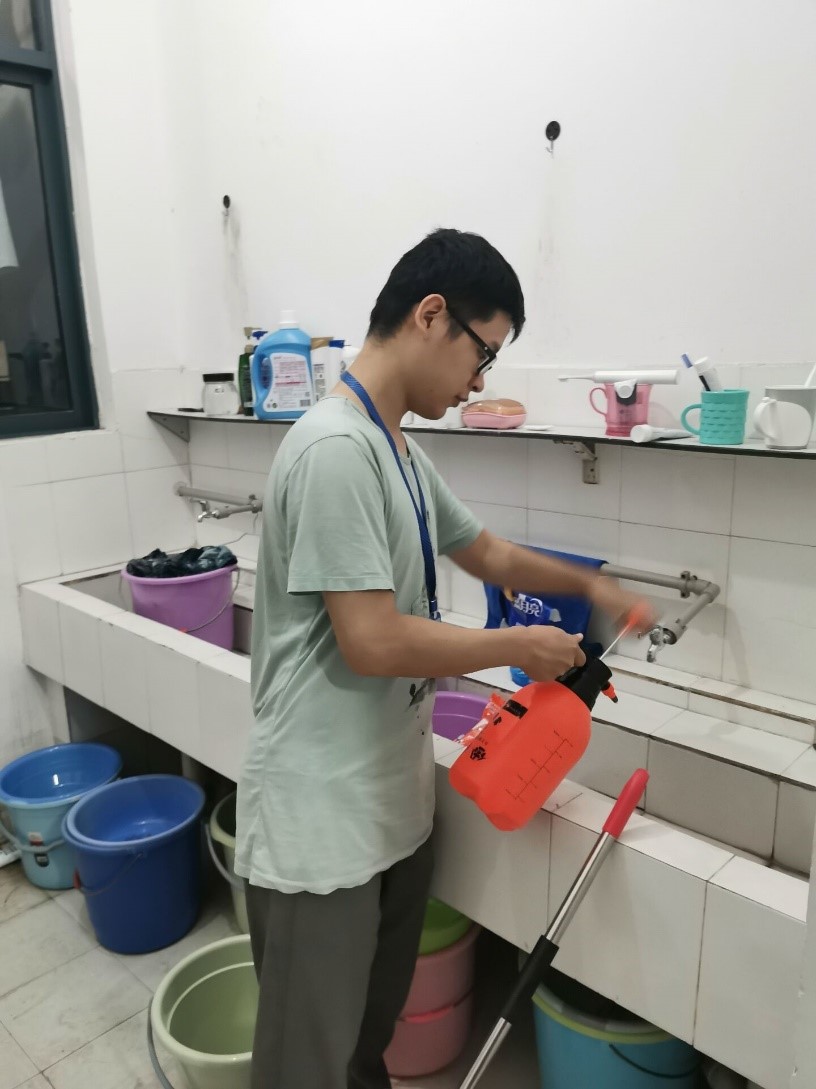 在工作开始前,学工办王成瑞老师强调此项工作的重要性,王老师要求对消毒液的配比务必要严格按照说明来配制,宿舍信息卡要确保每间宿舍信息的准确性不可麻痹大意。随后社区服务中心主任董艳鹏同学强调了消杀的注意事项,曹雨晴同学给组织成员分配好新生住宿信息卡,要求在发放时需要向学生确定信息的正确性。接着,各组织成员将配置好的消毒液装入喷壶后,严格按照消毒的规范性,对新生宿舍开展全面的消杀工作。对学生宿舍的走廊、卫生间、水槽、阳台等区域进行反复喷洒,做到不留死角,达到有效的防疫目的。