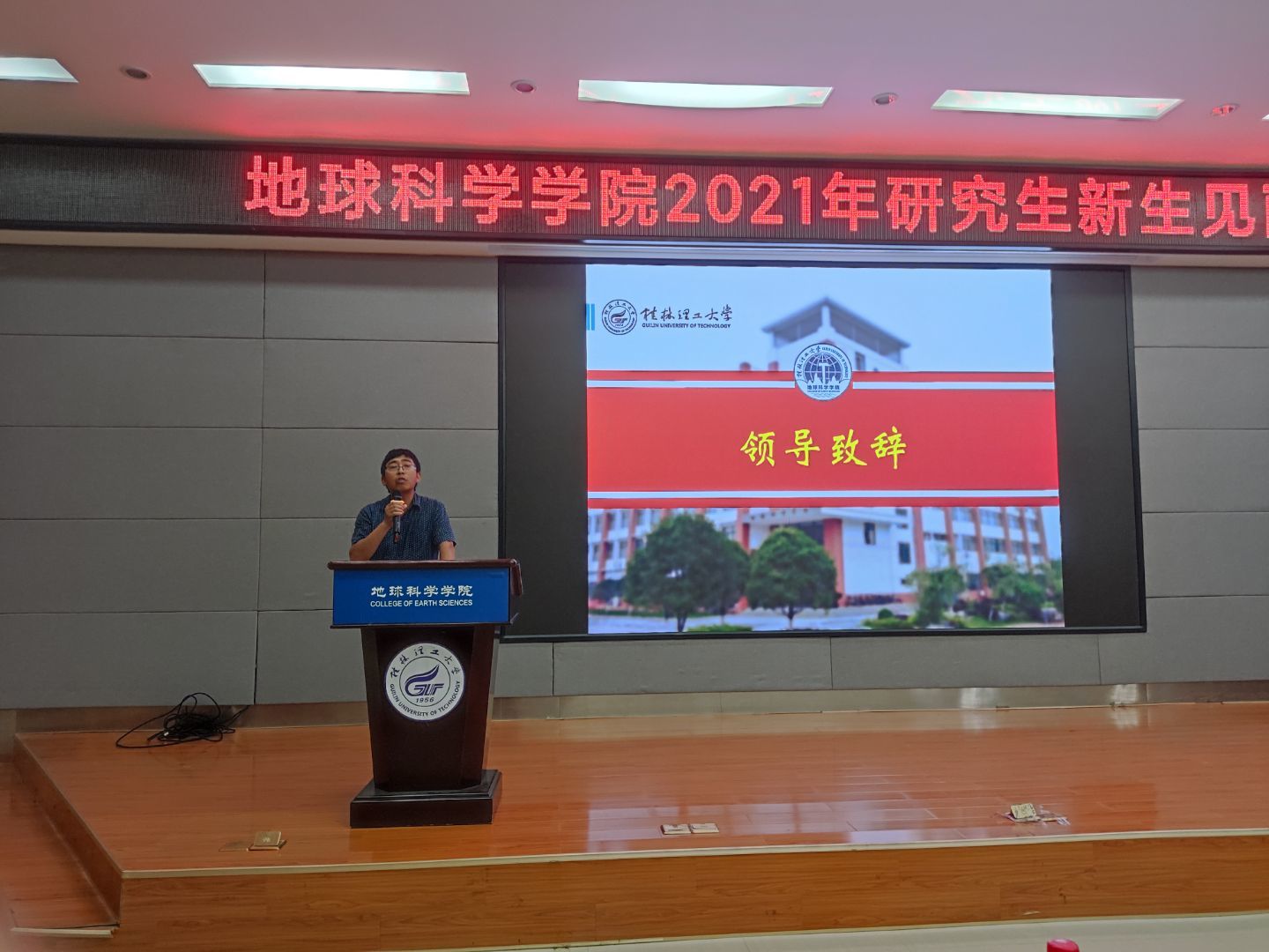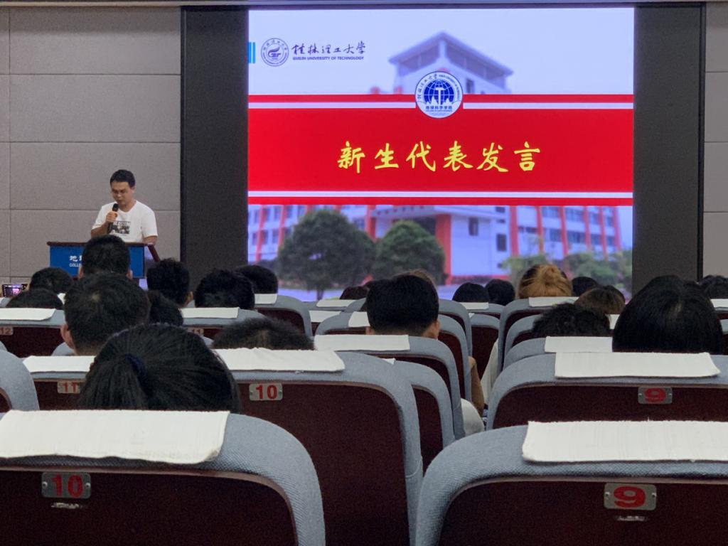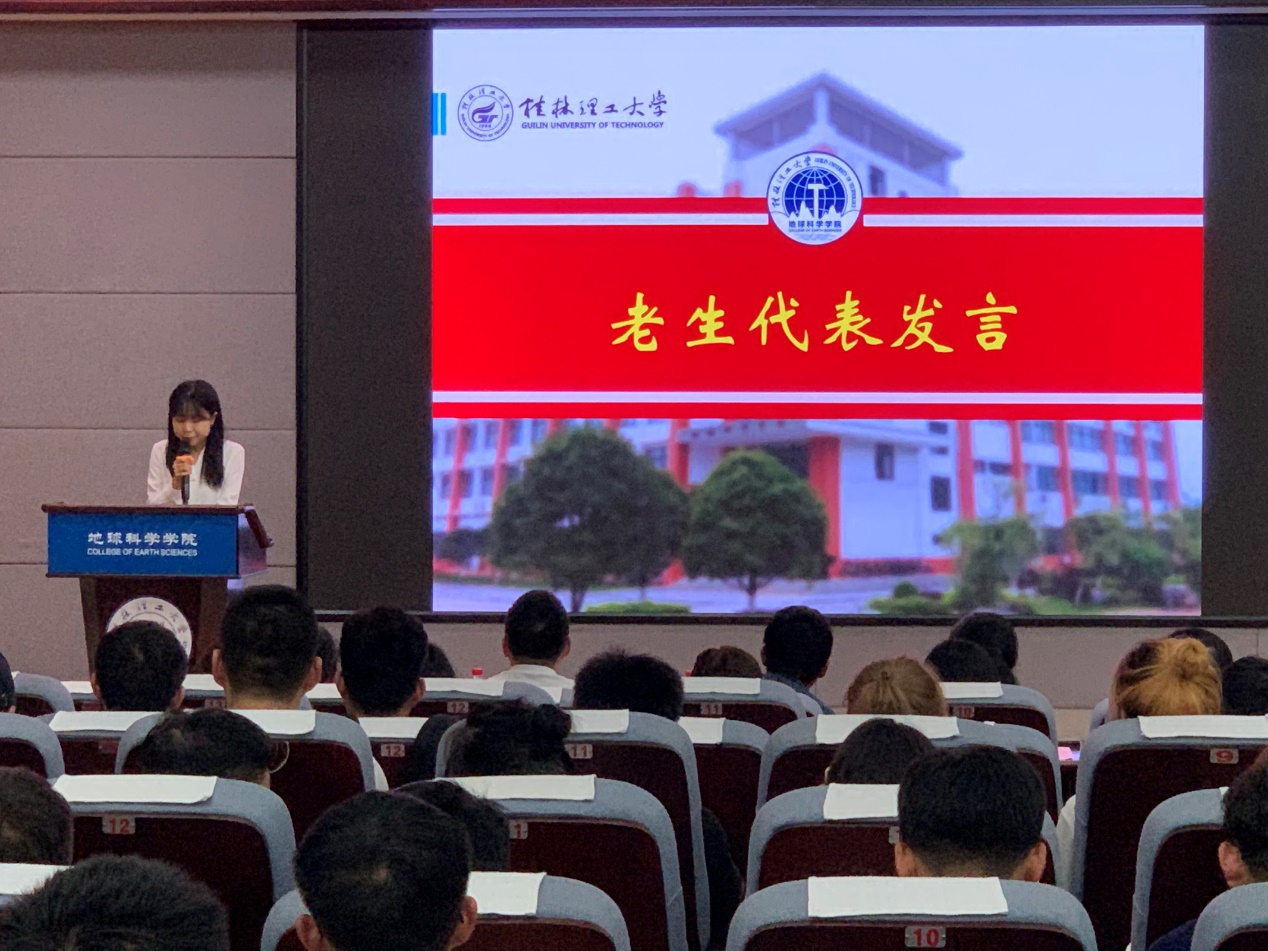 新生见面会暨入学安全教育大会在激昂雄壮的国歌中拉开帷幕。第一阶段为新生见面会,会议开始,学院副院长吕玉增教授向从天南海北汇聚在桂工校园的2021级研究生的到来表示热烈的欢迎。吕教授感叹道,一入桂工门,一生桂工情,从今天起“厚德笃学,惟实励新”的桂工校训,将伴随同学们成长,随后又介绍了我校历史,并鼓励各位新生要树立远大理想,要志存高远,把专业与社会发展、国家战略联系起来,在研究生期间要诚信、勤奋,与老师保持良好的关系。随后,21级硕博连读生宋宇嘉同学作为老生代表发表了演讲,表达了对新生的欢迎和祝愿,并分享了自己的学习经验,21级地质学班的孟鑫作为新生代表上台发言。最后,与会人员以饱满的热情奏唱校歌。