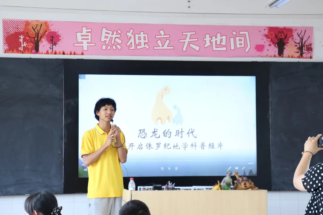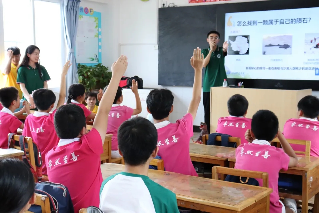 活动前期,为提升义务支教效果,活动参与成员们针对义务支教对象开发了两个授课课程,并对课程内容进行了反复的研讨、完善和试讲模拟。活动开始后,首先由受助学生葛黎明主讲《来自地球外的石头》课程,先后向同学们讲解了一些关于陨石的小知识。随后由受助学生叶立志讲授《我的宠物是恐龙》课程,带领同学们探索许多关于恐龙的秘密,授课过程气氛活跃。活动最后,志愿者们给同学们赠送了恐龙小玩偶作为活动礼物,受到了同学们的热烈欢迎。