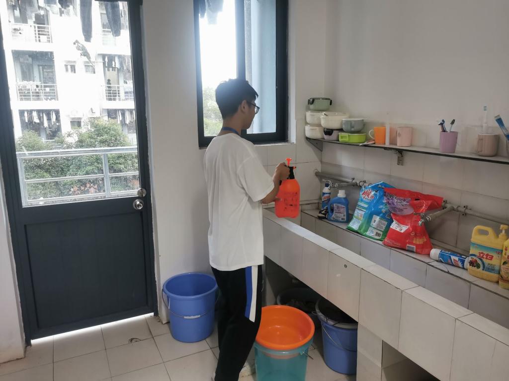消毒工作主要对宿舍地面、阳台、卫生间、洗手池、门把手、水龙头开关、床底等区域进行了统一消杀,做到不留死角、不留盲区。同时提醒同学们要做好个人卫生、地面每日一扫拖、垃圾每日一倒、加强室内通风等清洁要求。