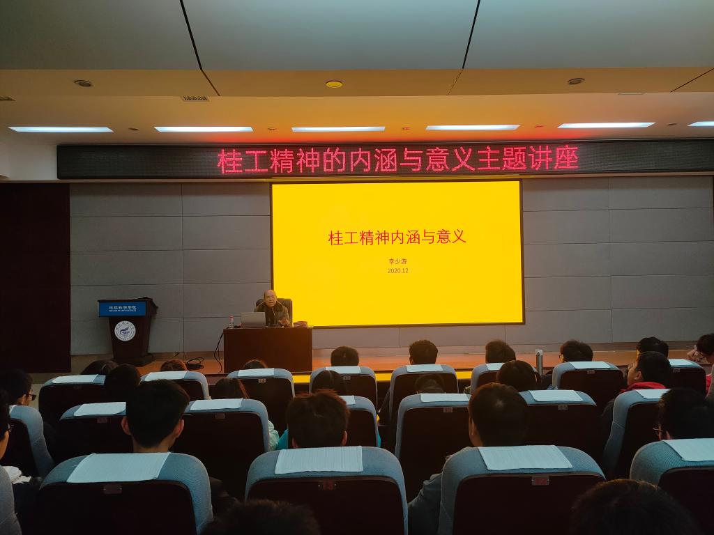 为加深地院新生对“桂工精神”的理解,将桂工精神内化于心、外化于行,助力新生更好成长,2020年12月4日晚,学院在01501报告厅举行桂工精神的内涵与意义主题讲座。此次讲座由我校旅游与风景园林学院原党委书记李少游教授担任主讲,由我院学工办夏雪莲老师主持,200余名新生参加。