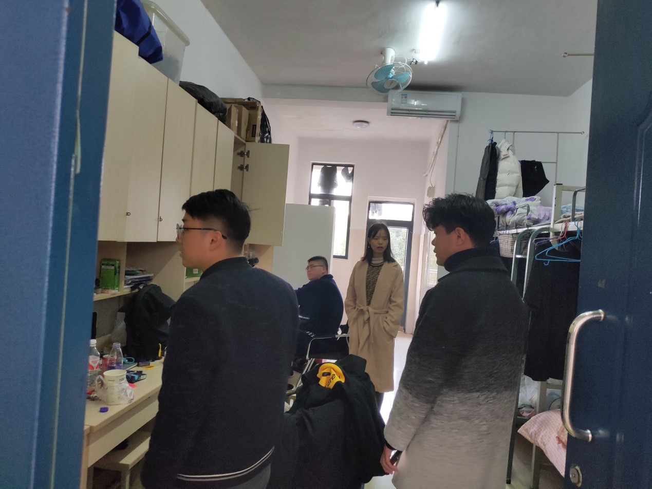 为进一步了解地学院研究生的宿舍生活情况,提高同学们的住宿安全意识,2020年12月1日下午,学院学工组长陈文甫老师和研究生辅导员周密老师在学院研究生会干部的陪同下对学院研究生宿舍进行走访检查。