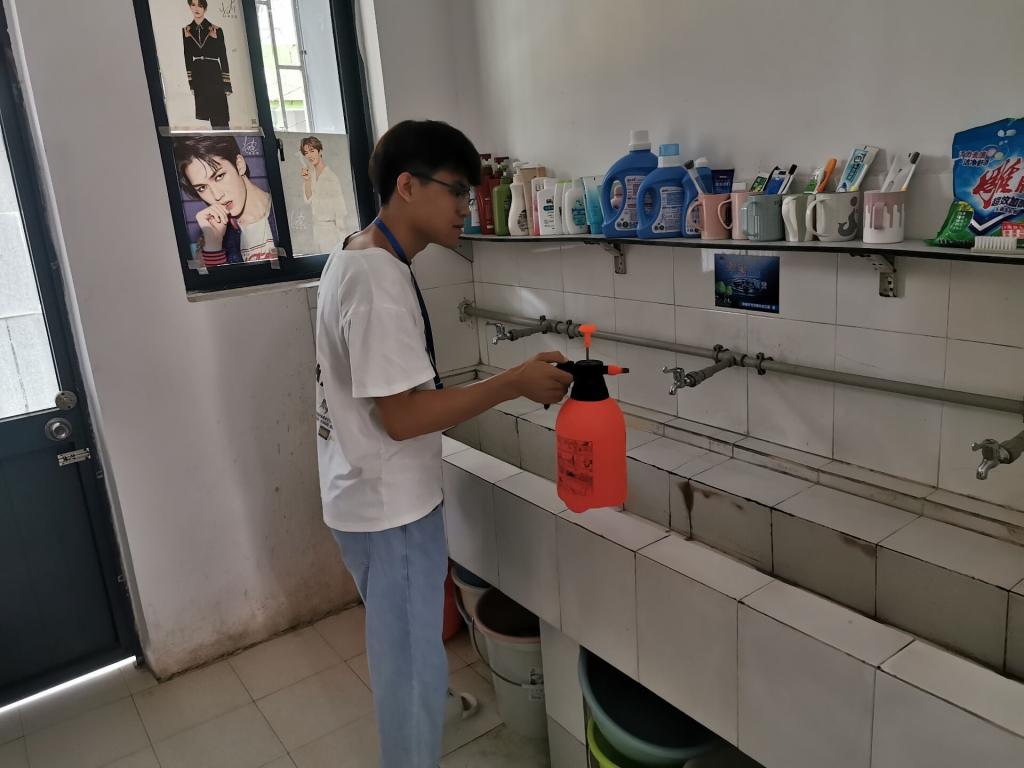 志愿者们进入各个宿舍,进行了仔细认真的消毒工作。并针对宿舍中水池是否有水垢、地板是否干净、桌面是否整洁、阳台是否清洁、卫生间是否干净无异味、垃圾桶里是否有垃圾、是否及时清理垃圾等方面进行中肯公平的评分。