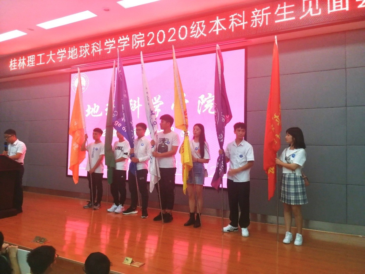会议伊始,主持人介绍到会领导,全体师生奏唱国歌。会议第二项为学院党委书记曹文献致欢迎辞,曹书记在讲话中表示了他对全体新生的热烈欢迎与殷切期盼,希望新同学们能够适应大学生活,尽快融入地院这个大家庭。会议第三项为教师代表彭三曦老师,18级学生代表许塬浩,20级新生代表蒙权依次进行发言,他们为新同学们提供了宝贵的建议。会议第四项为学院常务副院长熊彬进行讲话,熊副院长对新同学们表示了热烈欢迎,介绍了本学院各专业特色与方向,并表达了对2020级新生们的高度期望,希望全体新生刻苦钻研,发扬地院精神。最后,曹书记和熊副院长为新生代表发放院徽和授旗,全体师生佩戴院徽,奏唱校歌,本次会议宣布结束。