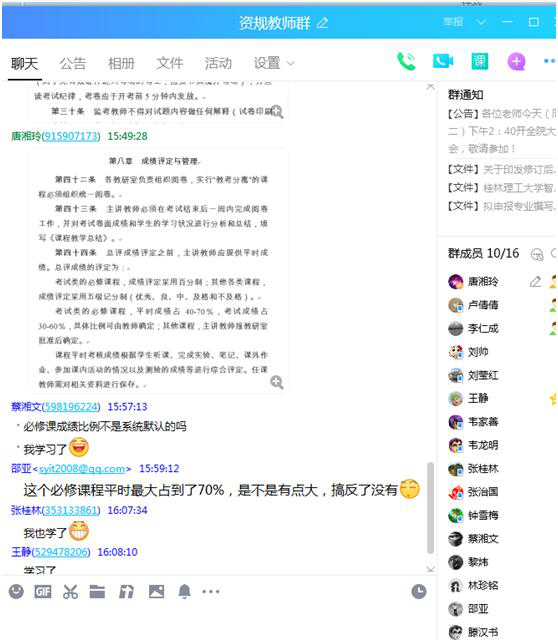 在本次线上学习活动中,对《桂林理工大学全日制本科考试管理规定》内容进行了解和把握,其中包括考场监考要求、成绩与评定管理等,主要强调试卷的规范性和监考的严肃性,要求各位教师严格执行学校的管理规定,教研室教师们积极参与此次学习活动,对管理规定内容进行讨论,并交流所学心得,一致认为可以通过考试检验学生的学习成效、提高培养质量。