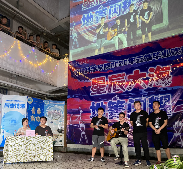 晚会分为“师恩难忘”、“同窗情深”、“青春有你”、“桂工有我”四个环节。晚会伊始,研究生代表进行开场表演,演唱歌曲《无人之岛+no fear in my heart+啊 朋友再见》,唱出了对老师、学弟学妹以及自己未来的美好祝福。接下来,各毕业生宿舍代表通过线上的形式依次为我们表演歌曲、舞蹈等节目。毕业班辅导员谷正杰为各毕业生宿舍送去了西瓜以及毕业美好祝福。随后,学院党委书记曹文献、院长许成、副院长吕玉增等老师通过视频的方式为毕业生送祝福。晚会最后,24栋宿舍楼全体师生合唱《桂林理工大学之歌》。晚会结束后,全体工作人员合影留念。