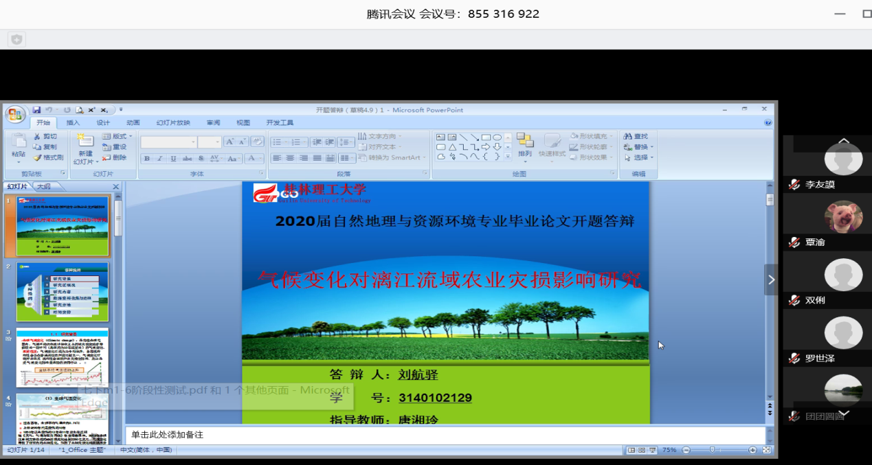 为最大程度减轻疫情对本科生学位申请与授予工作的影响,确保学位申请各环节工作顺利进行,在学校、学院党委“停课不停学”的部署与号召下,自然地理与资源环境教研室全体教师积极响应,充分准备,把传统的线下教学“搬”到了线上,于4月10日组织2020届本科毕业生通过“腾讯会议”平台进行毕业设计(论文)开题答辩。本次线上抽取2016级13名学生准备PPT答辩,但要求2016级全体学生参与聆听。答辩评委由自然地理与资源环境专业13名指导教师担任,张桂林教授作为答辩主席主持答辩会议。