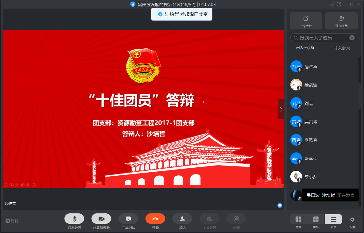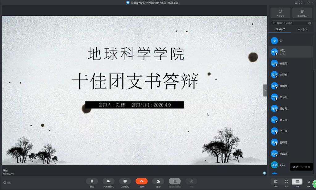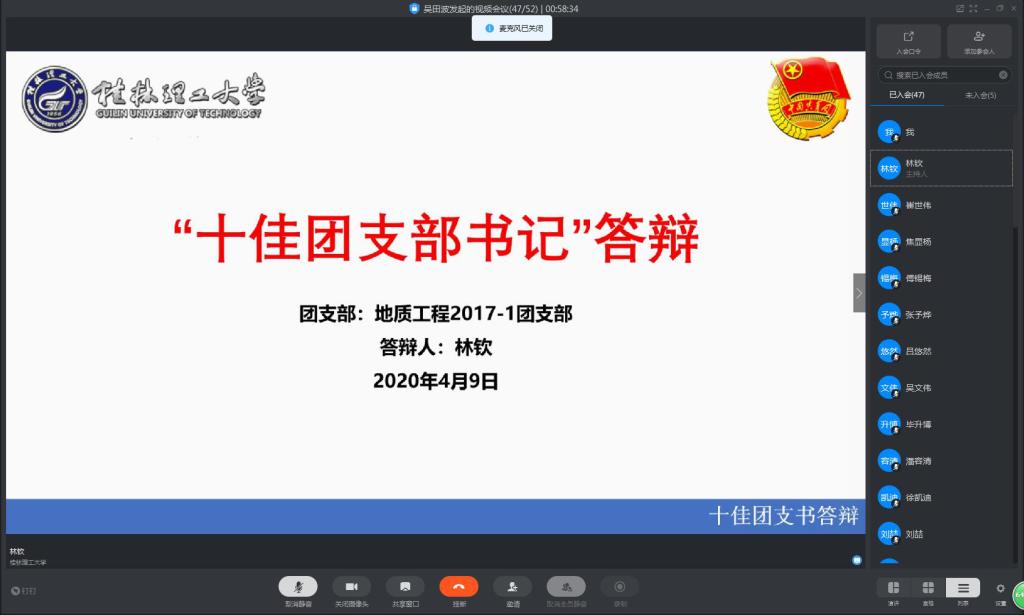 为进一步做好我院共青团员中发展党员的工作,加强对广大团员青年的思想教育,提高学生团员素质,发挥其先锋模范作用,不断向党组织输送新鲜血液。2020年4月9日,地学院团委组织召开团支部网络会议。会议主要内容为:部署“推优工作”,“十佳”团支部、团支书、团员答辩。本次会议由吴田波老师主持,答辩会由各团支部团支书担任评委。