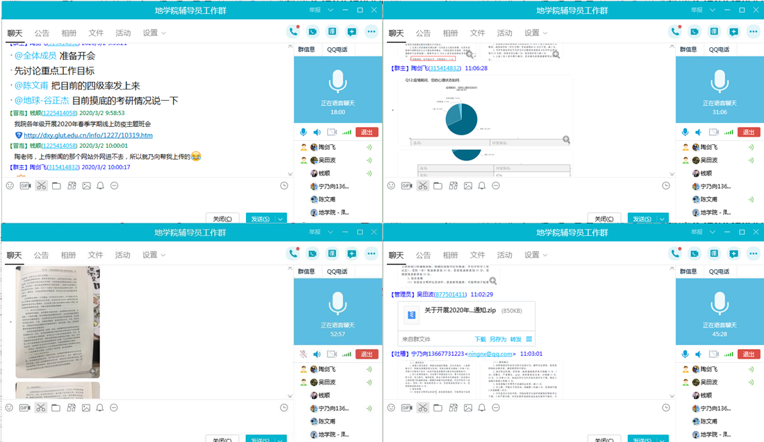 2020年3月2日上午,我院党委副书记陶剑飞和学工办各年级辅导员老师通过QQ群开展线上语音会议。会议的主要内容为学院学风建设以及共青团相关的工作等。