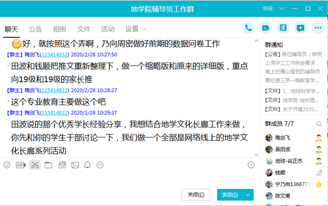 2020年2月28日上午,我院学工办老师通过QQ群议开展专业认同教育主题研讨会。