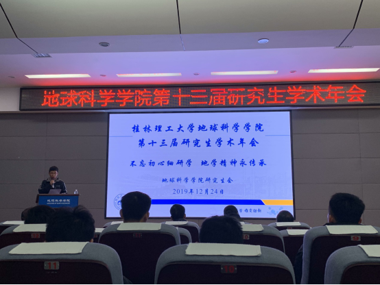 为加强学术交流,提高研究生科研与创新能力,2019年12月24日上午9时,beat365手机版官网入口第十三届研究生学术年会在我院逸夫楼01501学术报告厅拉开帷幕,本次年会主题为“不忘初心细研学·地学精神永传承”。出席本次年会的嘉宾有:校研究生院副院长代俊峰老师,学院院长熊彬老师,副院长吕玉增老师,重点实验室主任刘希军老师,研究生辅导员周密老师。邀请评审老师有:徐庆鸿老师,李仁成老师,罗润林老师,杨金豹老师,梁德贤老师。我院全体19级研究生及部分17级、18级研究生到场聆听、交流。