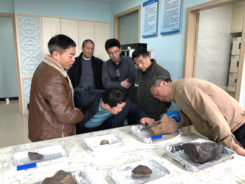 缪秉魁教授为胡浩总师一行介绍陨石标本