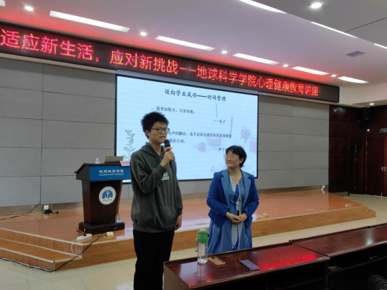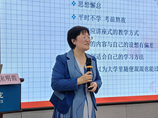 讲座中,宋明霞首先分析了大学生活与高中生活的不同之处,强调了自主学习、时间管理、团队合作等能力的重要性。随后,她结合心理学原理,深入浅出地讲解了面对新环境时常见的心理反应及调适策略,如如何正确面对学业压力、如何有效管理情绪、如何建立积极的人际关系等。宋明霞指出,适应新生活是一个必经的过程,关键在于如何积极面对和有效应对。她建议学生们首先要保持开放的心态,勇于尝试新事物,积极参与校园活动,以快速融入新集体。