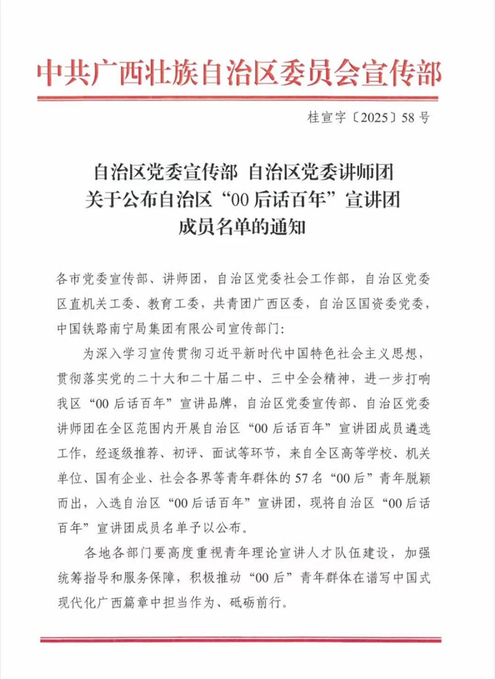 据悉,为深入学习宣传贯彻习近平新时代中国特色社会主义思想,自治区党委宣传部、自治区党委讲师团在全区范围内开展自治区“00后话百年”宣讲团成员遴选工作,经逐级推荐、初评、面试等环节,来自全区高等学校、机关单位、国有企业、社会各界等青年群体的57名“00后”青年脱颖而出,入选自治区“00后话百年”宣讲团。
